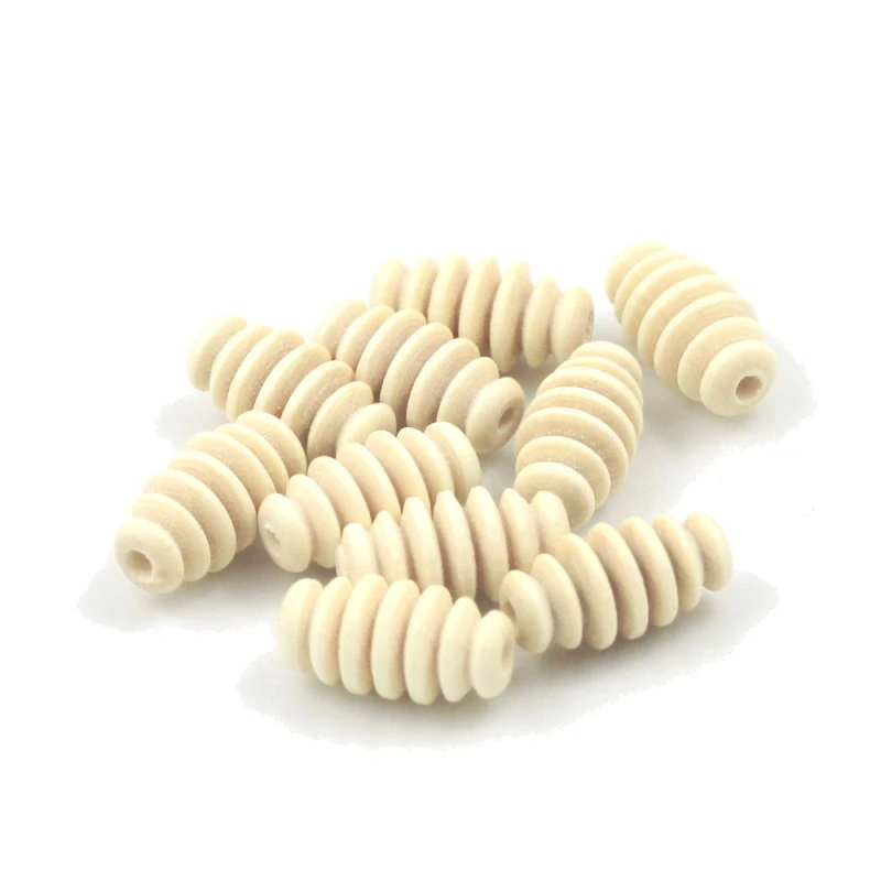 České dřevěné korálky – vřetena o rozměru cca 8x17,5 mm, barva krémová. Korálky jsou obarvené lihem ředitelnými barvami, zvýrazňujícími strukturu dřeva, a následně leštěné. Vhodné i na pedig.