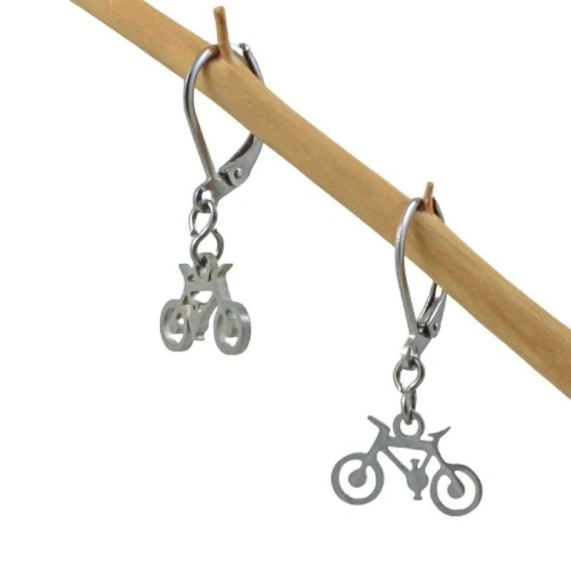 Jednoduché ocelové náušnice s uzavíracím zapínáním s přívěskem jízdních kol. Všechny kovové části jsou z chirurgické oceli 316(L).