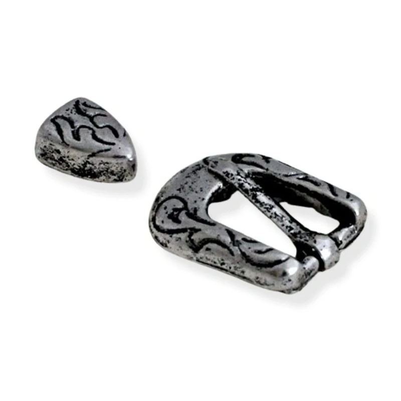 Dvoudílné kovové zapínání na pásek ve starostříbrné úpravě. Velikost cca: spona 19x25mm, koncovka 9x12 mm; vnitřní rozměr spony pro uchycení pásku je 10 mm, koncovky 7 mm.