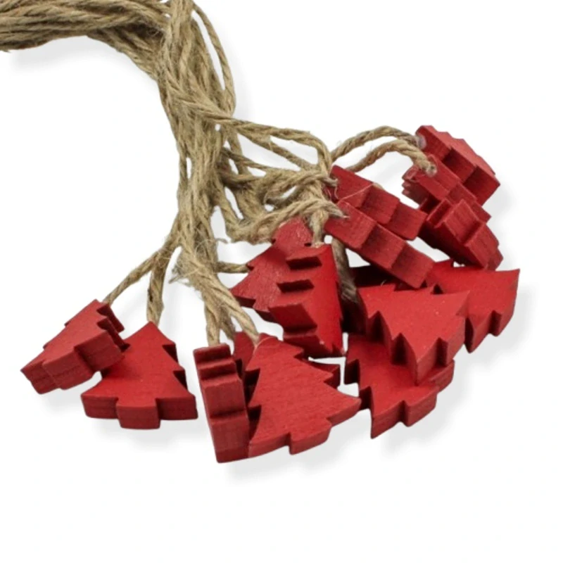 Stromek dřevěný červený na provázku – 16 ksSkladem 4 bal.90 Kč/ bal.