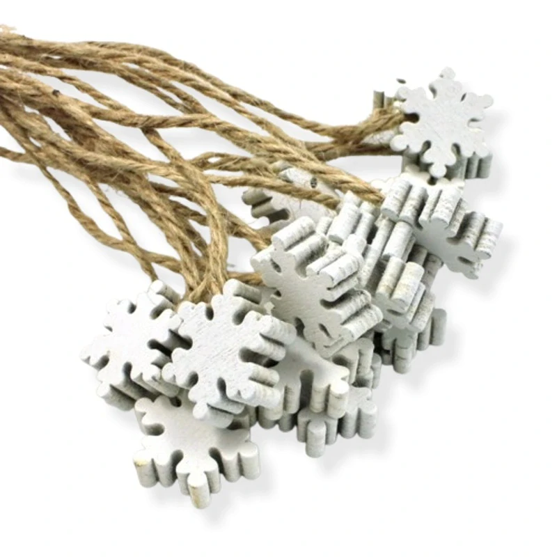 Vločka dřevěná bílá na provázku – 16 ksSkladem 4 bal.90 Kč/ bal.