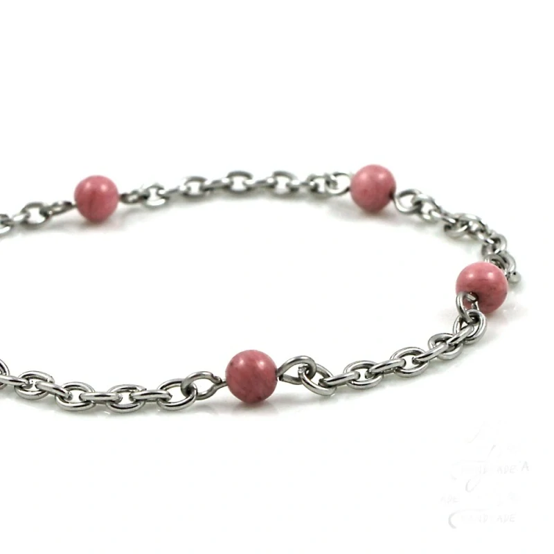 Jemný řetízkový náramek s drobnými minerálovými kuličkami (cca 4mm) rodonitu, zapínání na karabinku. Všechny kovové části jsou z chirurgické oceli 316(L).
